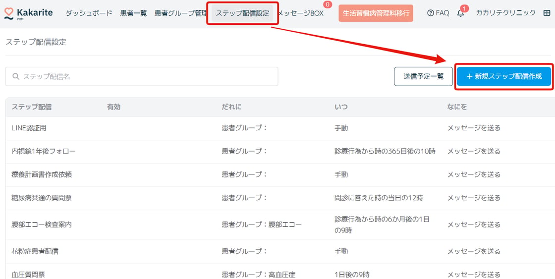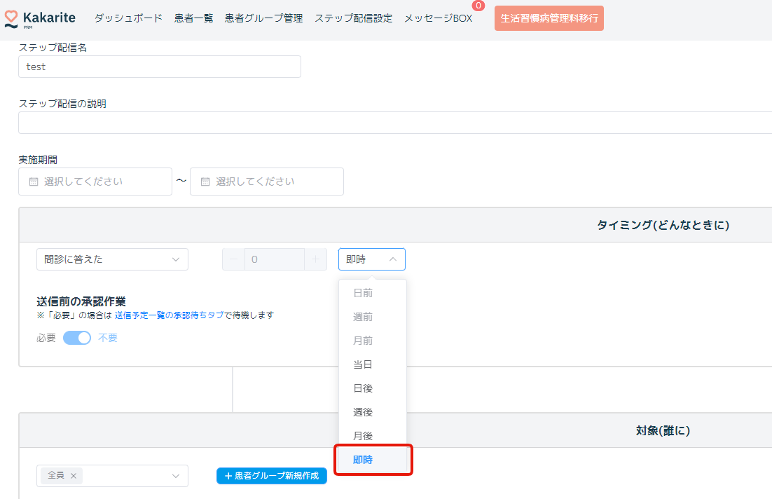 対象:あらかじめ登録しておいた患者グループを登録します。診療行為を行ったことを起点にステップ配信を作成する場合は、対象となる診療行為名も登録します。
