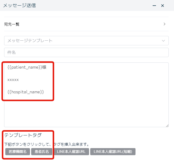 メッセージ本文中に患者名・医療機関名を自動で挿入できるようにするためのタグです。