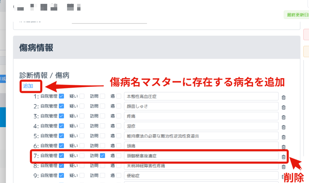 レセプト電算処理用傷病名マスターから近しい病名を探して代替的に使用する必要があります。傷病名の削除・追加は下記の通り「診断情報 / 傷病」のエリアで行ってください。