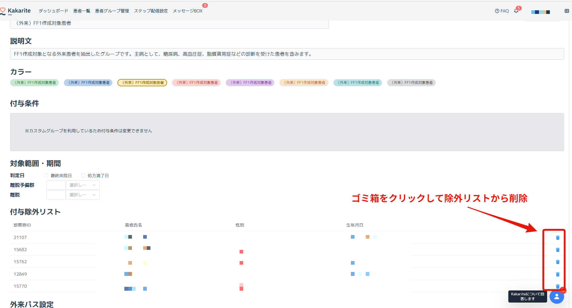 一度「付与除外リスト」に登録した患者を、また元の患者グループに戻す場合は、付与除外リストのゴミ箱マークをクリックして削除してください。システム側の夜間処理で患者グループが更新されるので、付与除外リストから削除した翌日に、その患者は元の患者グループに戻ります。