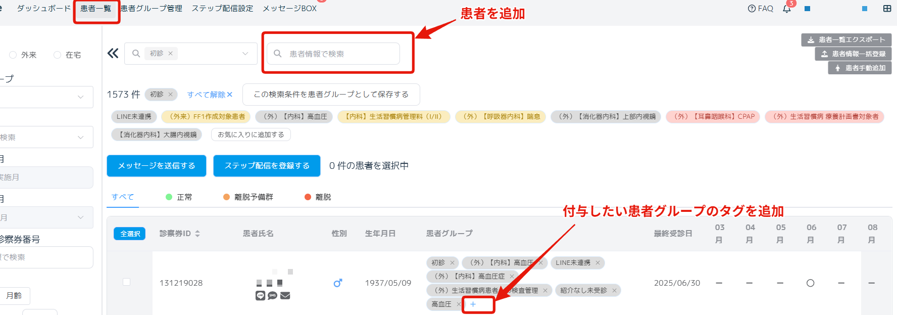 夜間処理による更新を待たず、すぐに元のグループに戻したい場合は、下記のように患者一覧画面で患者を検索し、+ボタンをクリックして付与したい患者グループ名を選択し追加ください。