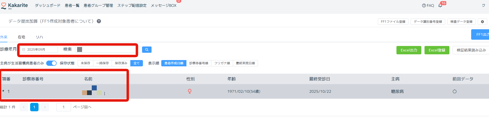 この操作を行った後、外来様式1作成画面に戻り該当患者を検索すると、FF1作成対象一覧に表示されることが確認できます。