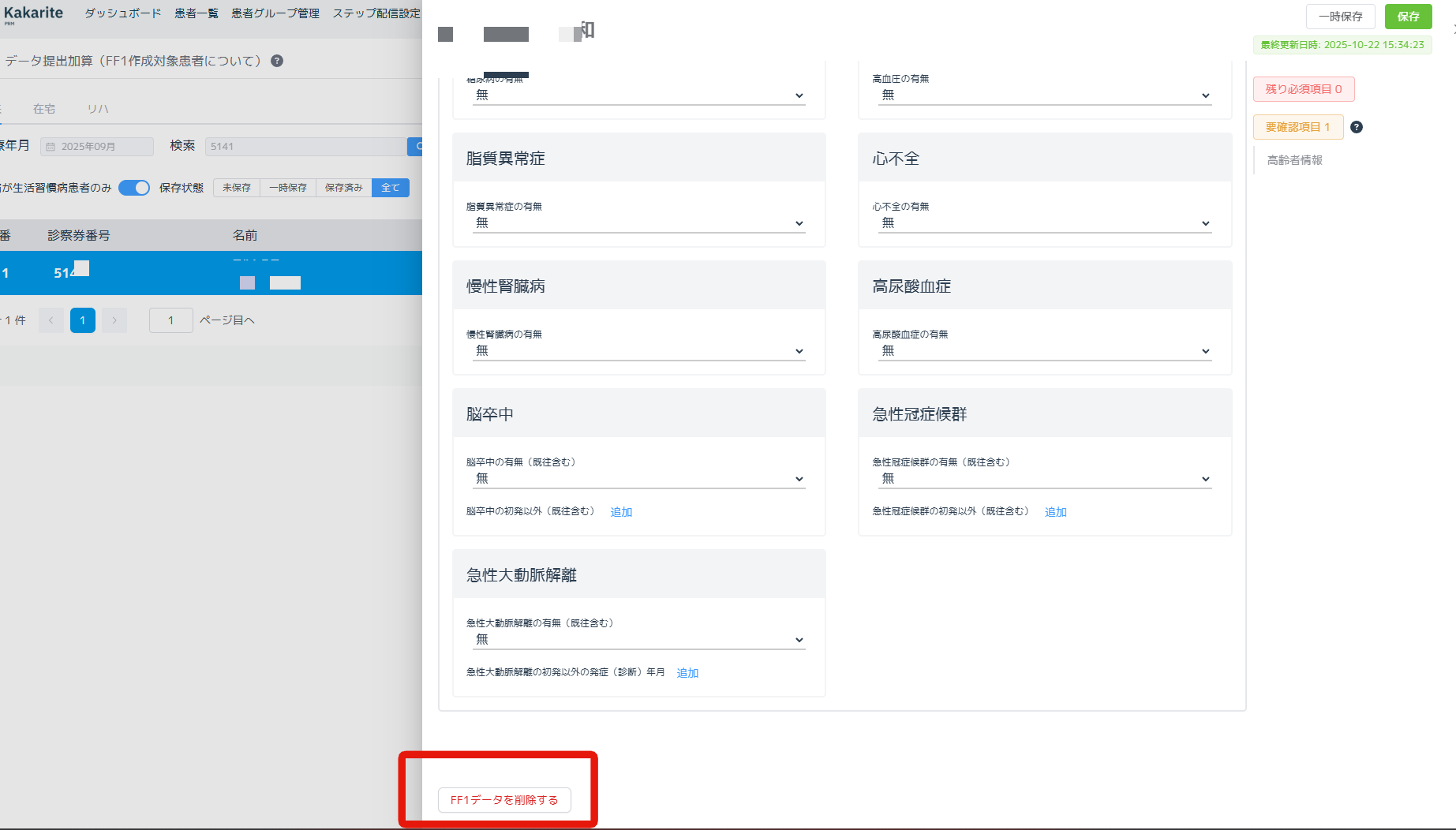 該当患者のFF1入力画面を開き「FF1データを削除する」ボタンをクリックしてFF1レコードを削除