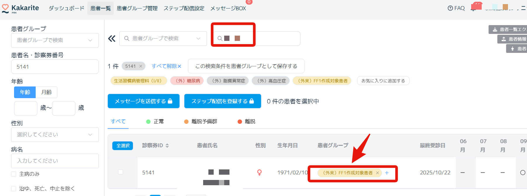 ①患者一覧で該当患者を検索し、手動でFF1作成対象の患者グループに追加