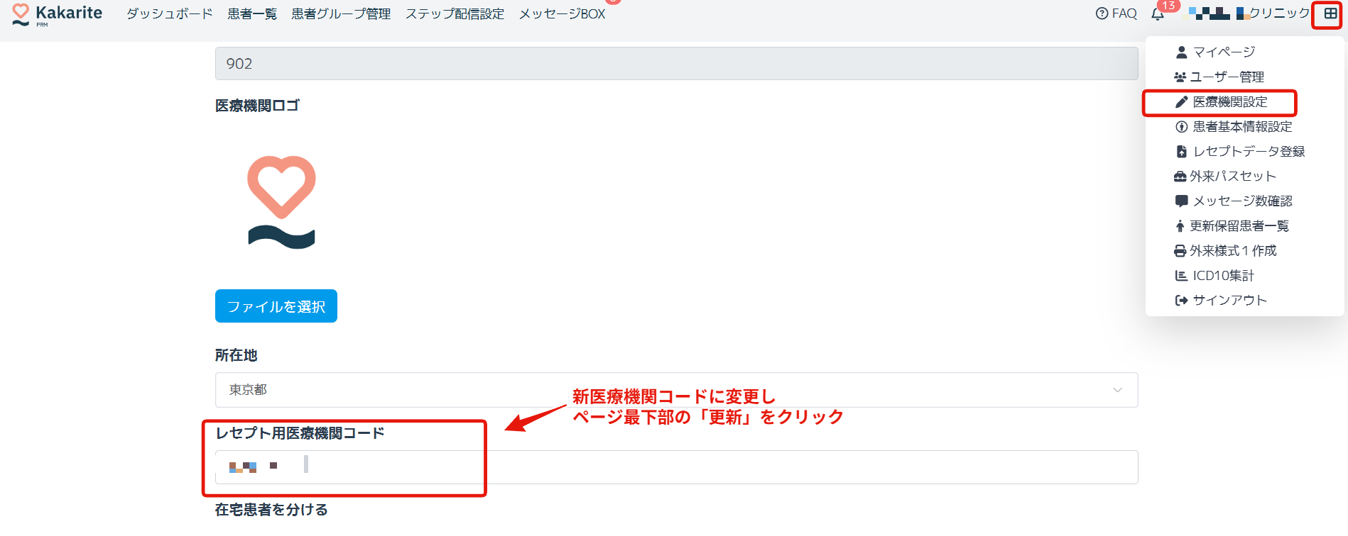 新医療機関コードでの提出に切り替わる際は、レセプトをカカリテにアップロードする前に、医療機関設定から「レセプト用医療機関コード」を変更し更新をクリックしてください。その後、その後通常の手順でカカリテにレセプトをアップロードしてください。