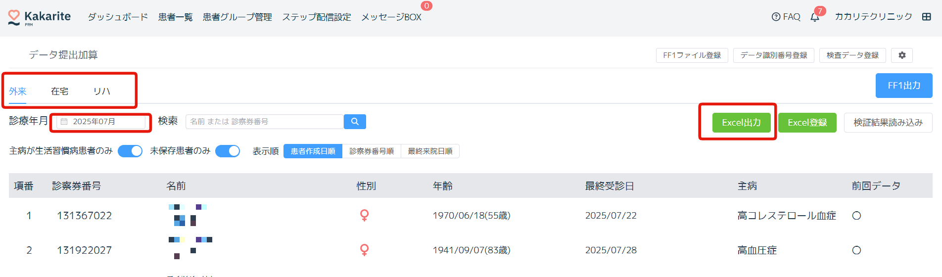 作成したい区分(外来・在宅)と診療年月を選択すると、当月の対象患者一覧が表示されます。「Excel出力」をクリックしてExcelファイルをダウンロードします。※画面上に表示されている全患者のデータが出力されます。
