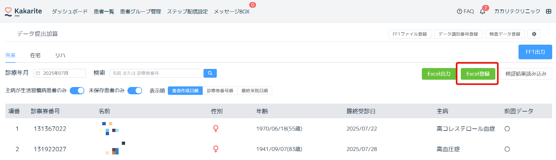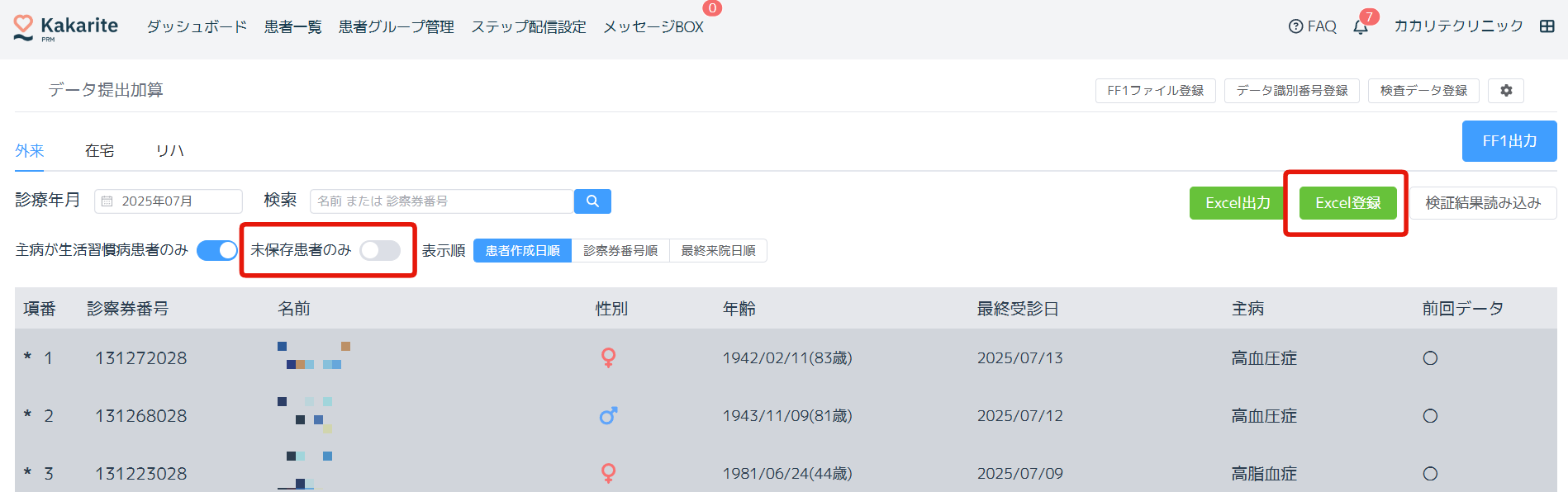 尚、FF1保存済の患者は画面上でデフォルトでは非表示となり、「未保存患者のみ」のスイッチをオフにすると表示される形となります。