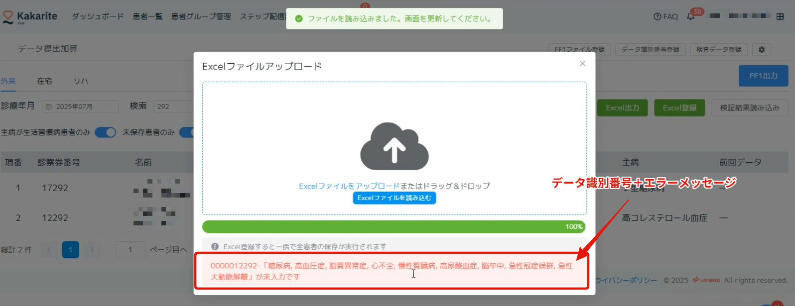 以下のようなエラー表示が出た場合は、エラー対象の患者のデータはFF1に反映されません。Excelデータの内容の見直し・修正を行い再度エクセルファイルをアップロードしててください。