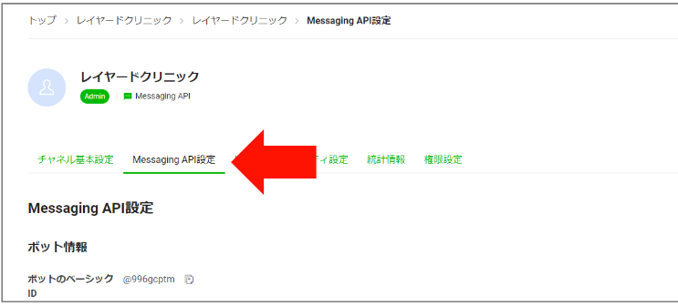②LINEデベロッパーズにログインし【Messaging API設定】のタブを開きます。