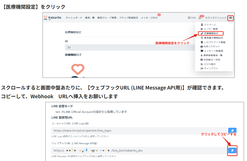 ①カカリテの「医療機関設定」よりWebhookURLを確認しコピーする
