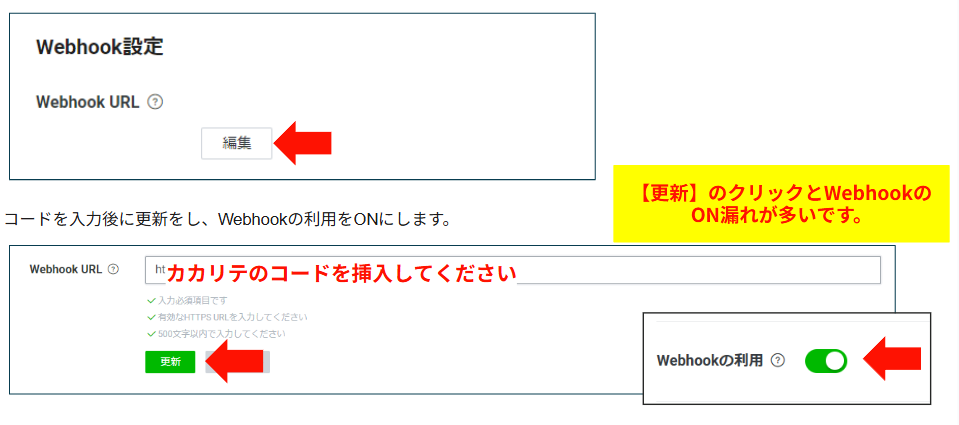 ③下にスクロールし、Webhook設定の【編集】ボタンを押して、コードを入力します。