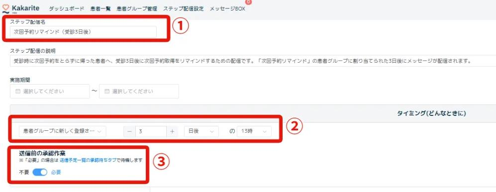 ①ステップ配信名を入力 ※医院管理用の名称です。患者側には表示されません。
