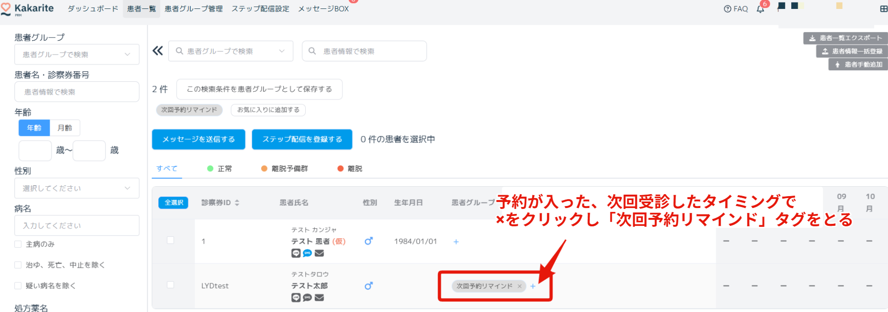 患者グループに割り振ると「次回予約リマインド」のラベルが付きます。