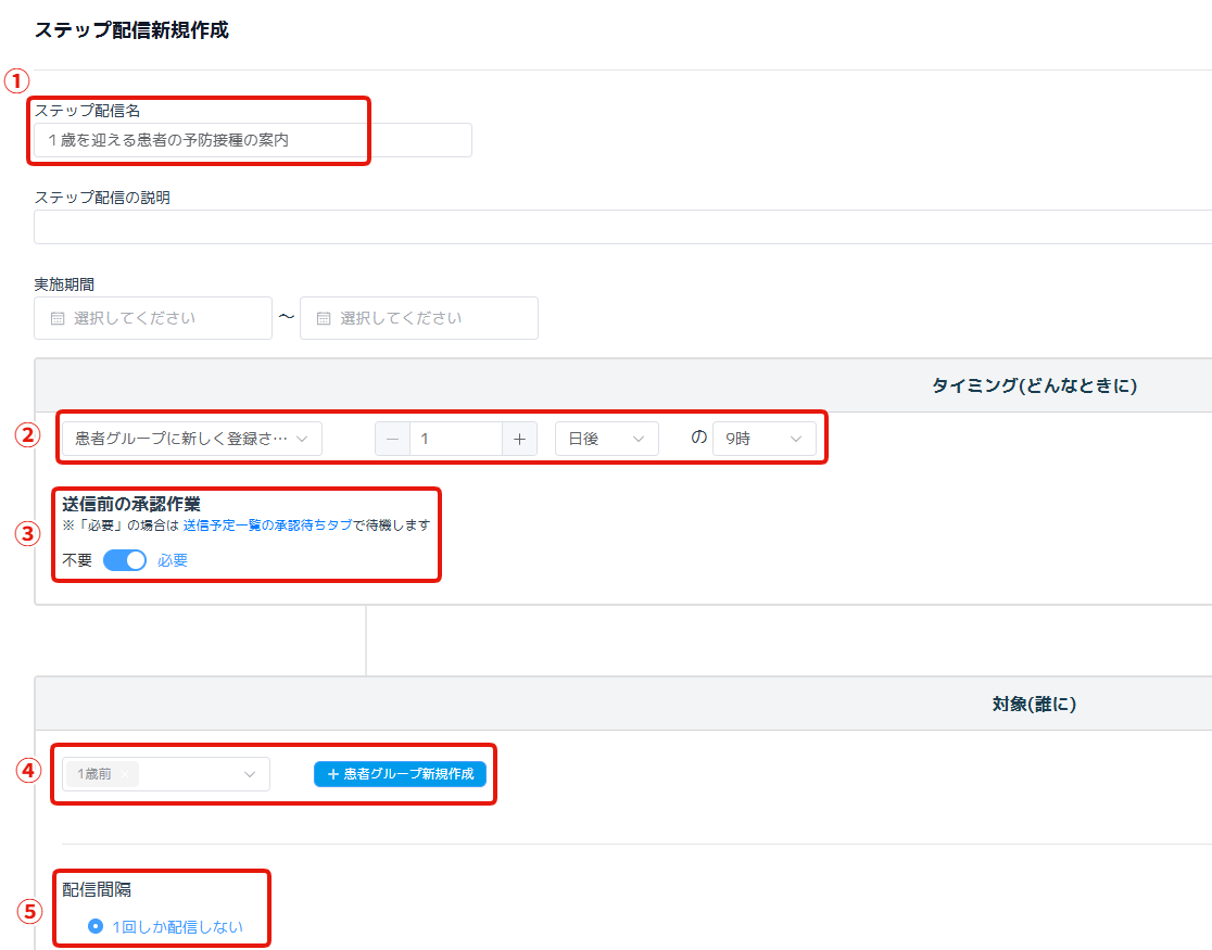 「患者グループに新しく登録されたから●月後の●日の●時」という形で設定します。上記は患者グループに新しく登録された1日後の9時に配信する設定です。