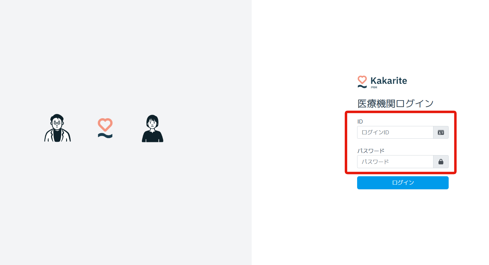 ②初回ログイン時は、サポートチームからのメール「PRM(患者管理システム)カカリテ アカウント発行のお知らせ」に記載されているID・初期パスワードを入力しログインください。