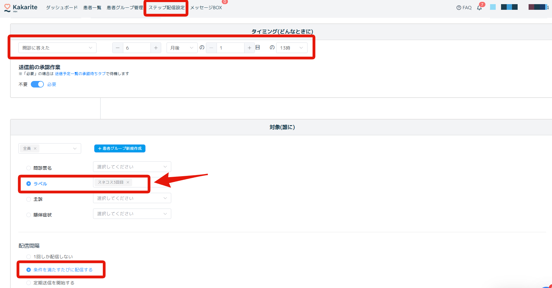 そして、カカリテのステップ配信設定で、配信対象:ラベル を選択し、上記で設定したラベル名を設定します。(今回の事例では「スネコス3回目」を選択しています)