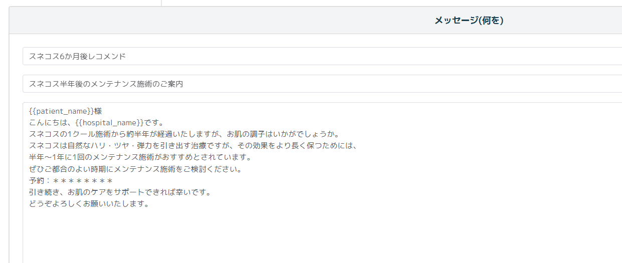 これで、3回目のスネコス施術を受けた患者に対し、6か月後にもう1クール実施頂くようレコメンドメッセージを配信することができます。