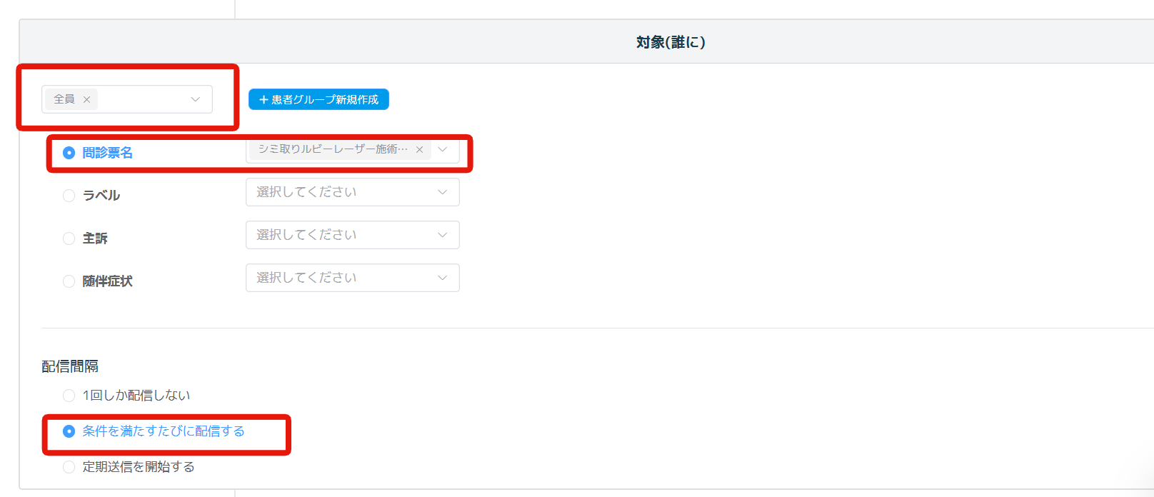 尚、例えば一つの施術が数回で1セット(1クール)となっており、何回目の施術なのかによってメッセージの配信内容や配信タイミングが異なる場合、もしくは●回目の施術後のみメッセージを配信したいというような場合は、WEB問診の「ラベル」機能を使うことで、メッセージ配信の細やかな出し分けができます。
