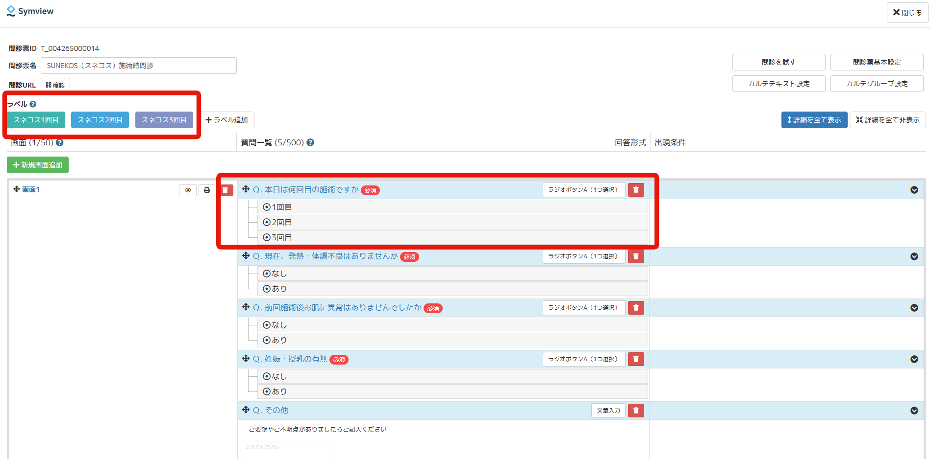 この場合、WEB問診内に「本日は何回目の施術ですか」というような質問を設定し、その質問の回答内容に応じてラベルが付与されるよう設定しておきます。FAQ:Symviewラベルの追加方法