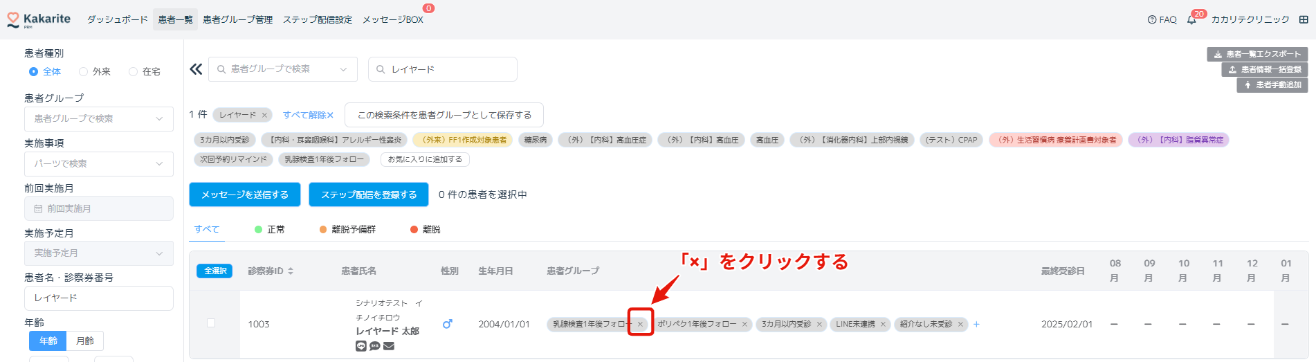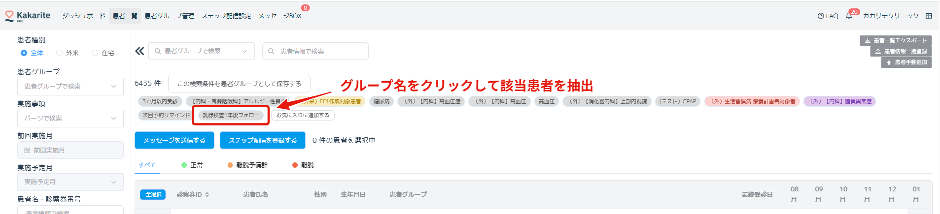 手順1.「乳腺検査3か月後フォロー」「乳腺検査1年後フォロー」などの名称で患者グループを作成します。2.検査フォローのタイミングごとに患者を各グループに割り振る3.検査案内の対象患者にカカリテで検査案内を自動配信する(メール・SMS・LINE)4.検査予約が入った、もしくは次に受診したタイミングで「乳腺検査1年後フォロー」のタグをはずすよくある質問関連記事