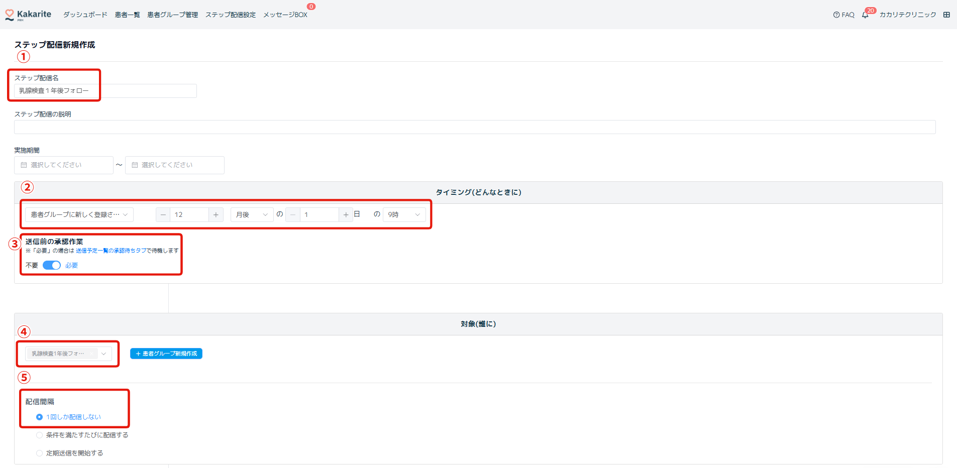 ※この設定により、患者グループに新しく登録された(=患者グループに割り振りを行ったタイミング)から12カ月後にメッセージを配信することができます。患者グループの割り振りを、検査結果が出て診察を行った際に実施することを想定した設定となっていますので、別のタイミングで患者グループ割り振りを行う場合は、配信タイミングの条件設定のカスタマイズが必要です。