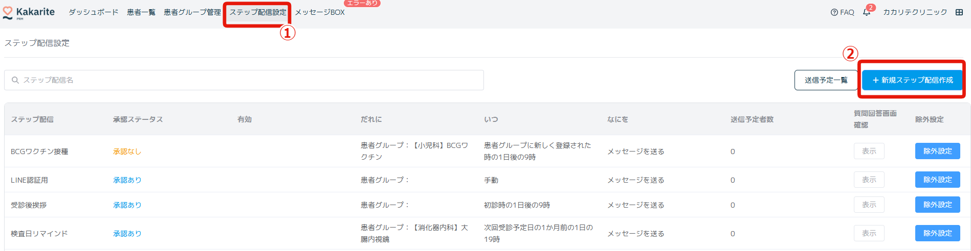 ①ステップ配信設定をクリック