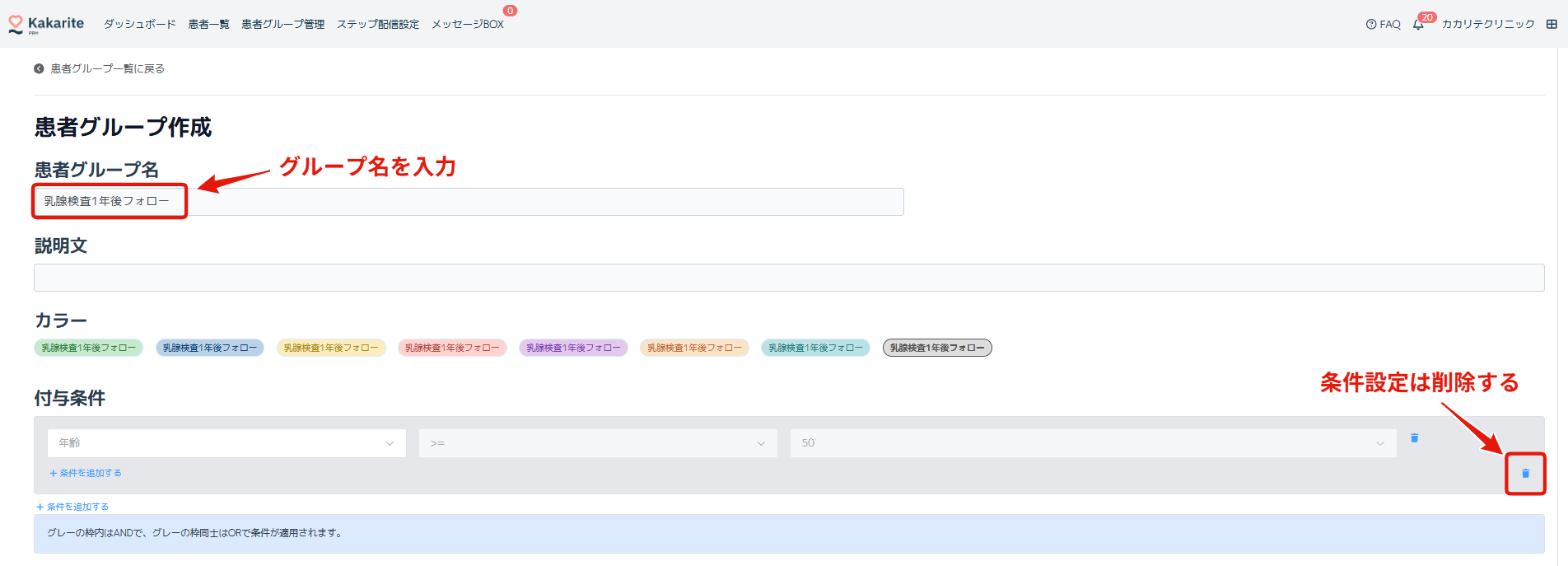 立ち上がった画面に「患者グループ名を入力」「付与条件を削除」後、画面左下の「登録」ボタンをクリック