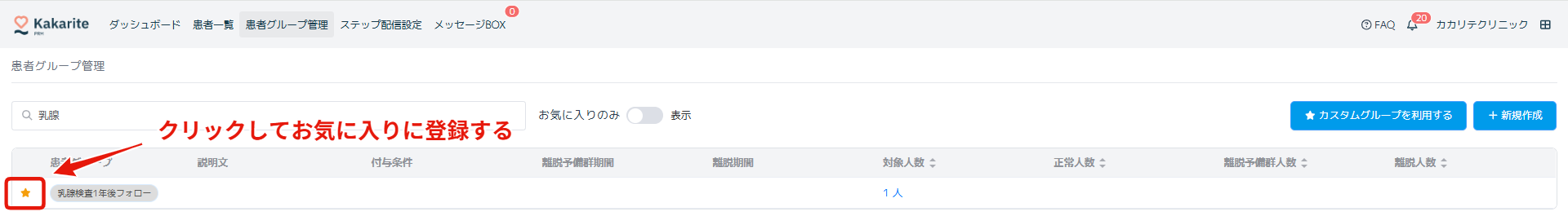 作成した患者グループについては、「★」をクリックしてお気に入りに登録しておきます。