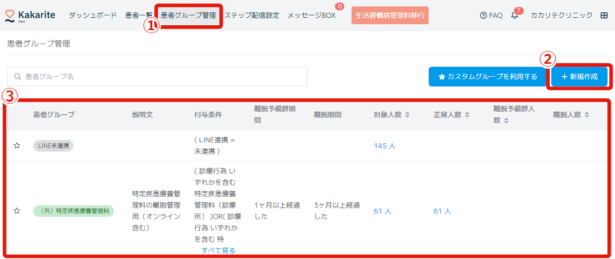 ①患者グループ管理画面をクリック