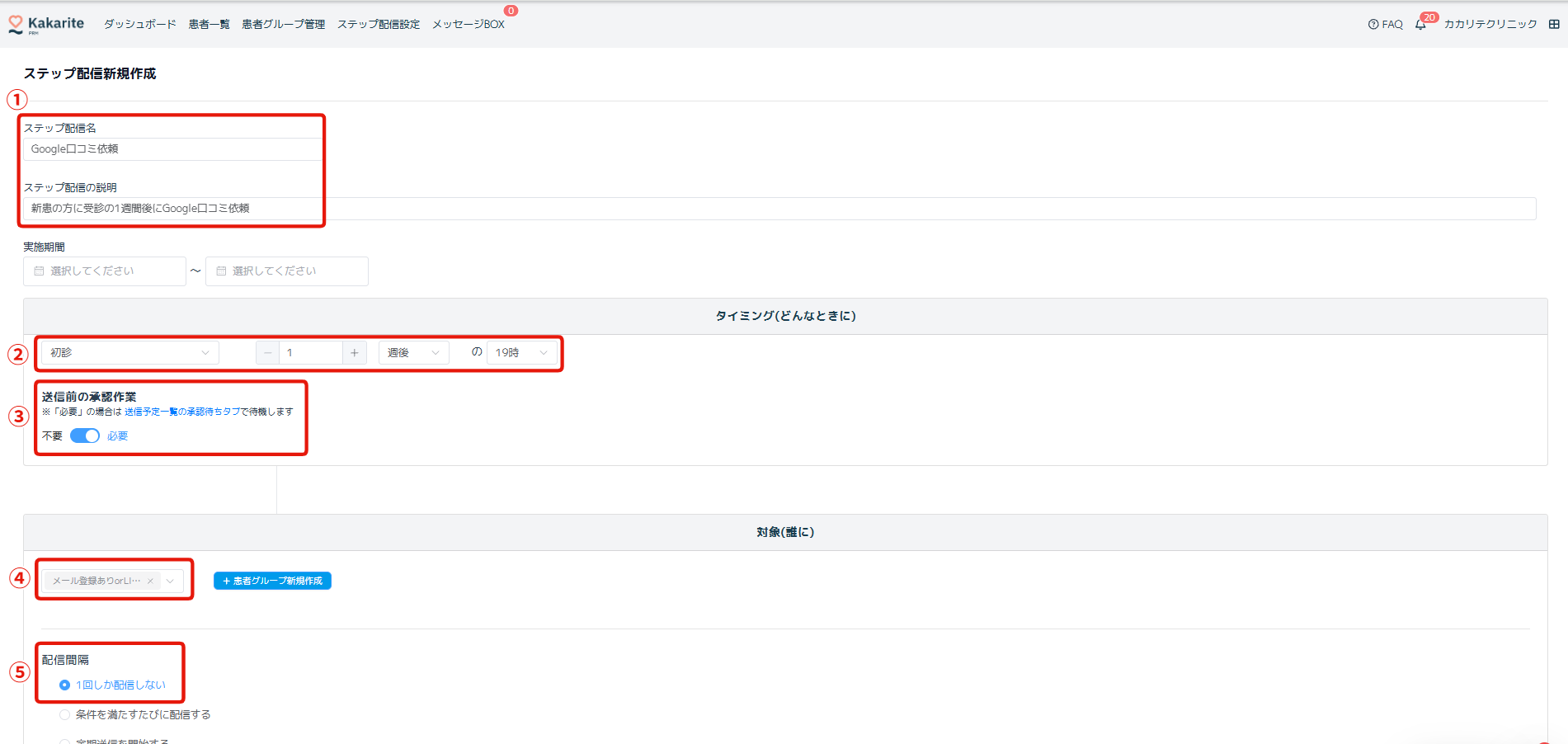 これで、初診の患者に対して受診から1週間後の19時に、「Google口コミ依頼」のメッセージを配信することができます。