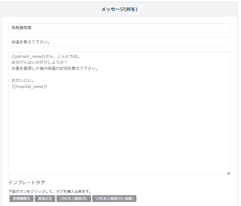 ②件名を入力。患者側に表示される件名です。例)「本日の血圧」「体温を教えて下さい」など