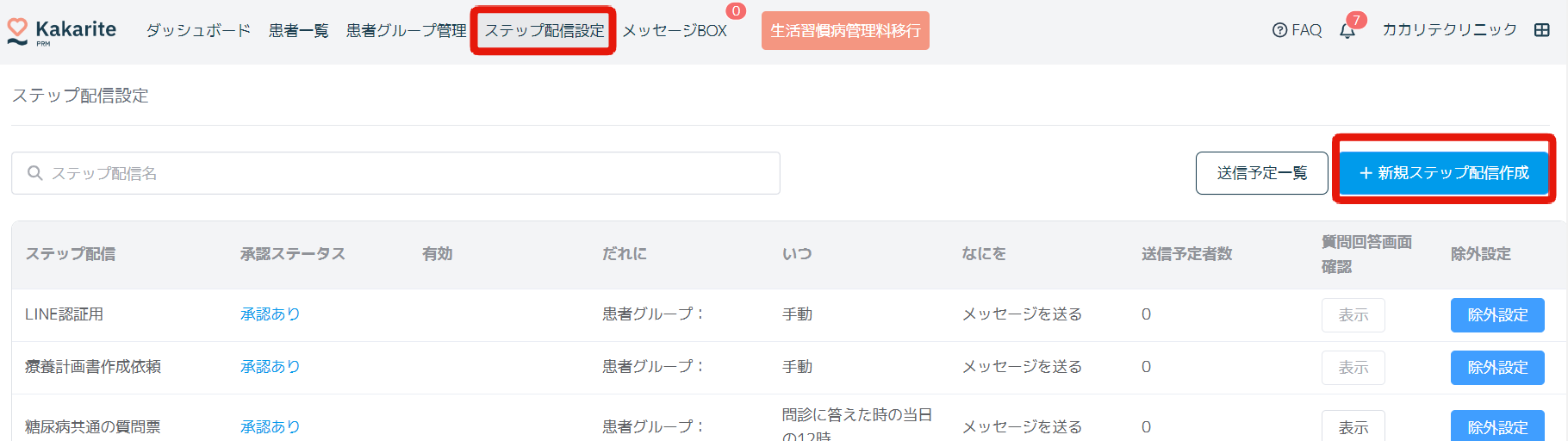 新しい質問票を作成したい場合は「新規ステップ配信作成」をクリックします。