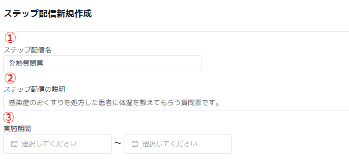 ①ステップ配信名:管理用の名称です。わかりやすい名前をつけてください。※患者画面には表示されません