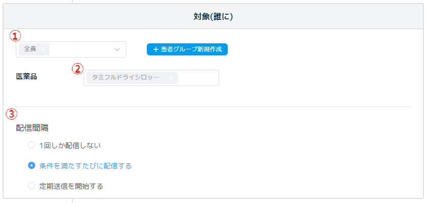 ②特定の医薬品の処方や、特定の診療行為の実施をトリガーにしてメッセージを配信する場合は、トリガーとなる医薬品名や診療行為名を設定します。