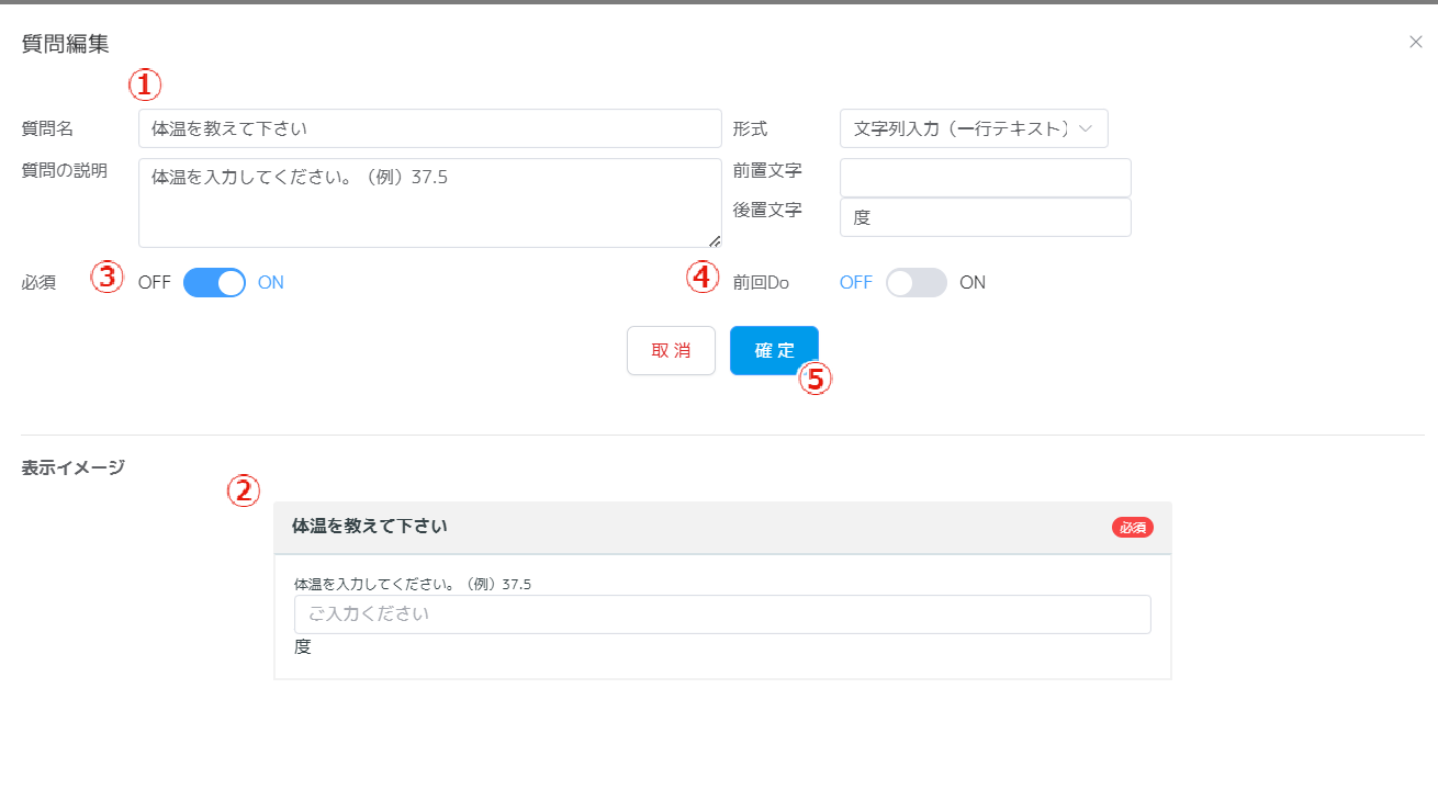 ③質問への回答が必須かどうか選択します。回答必須の場合はトグルボタンをONにしてください。