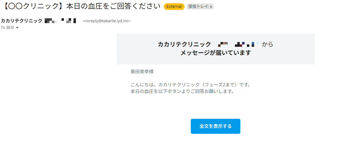 患者がリンクまたはボタンから質問票に回答すると、回答結果がカカリテに送信されます。