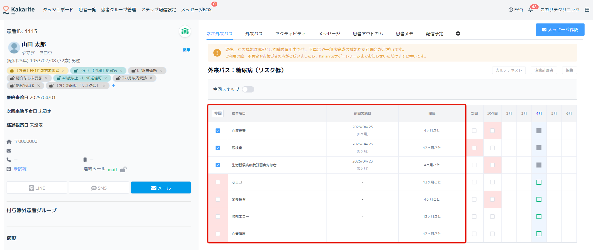 - 患者ごとに、どの検査をどのタイミングで実施するべきか一目でわかる