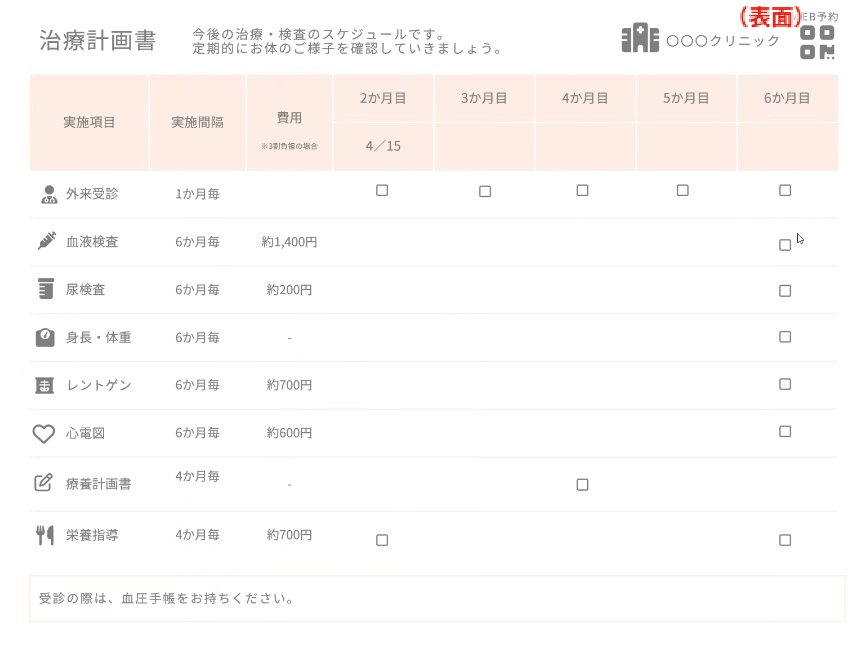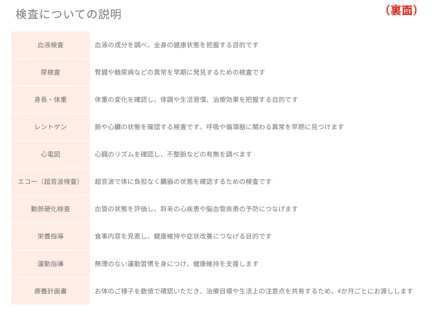 - 「治療計画書」には表面に検査のスケジュールや費用、裏面に検査内容の説明が記載されています。両面印刷をして患者様にお渡しし、治療計画の説明・理解促進にお役立てください。