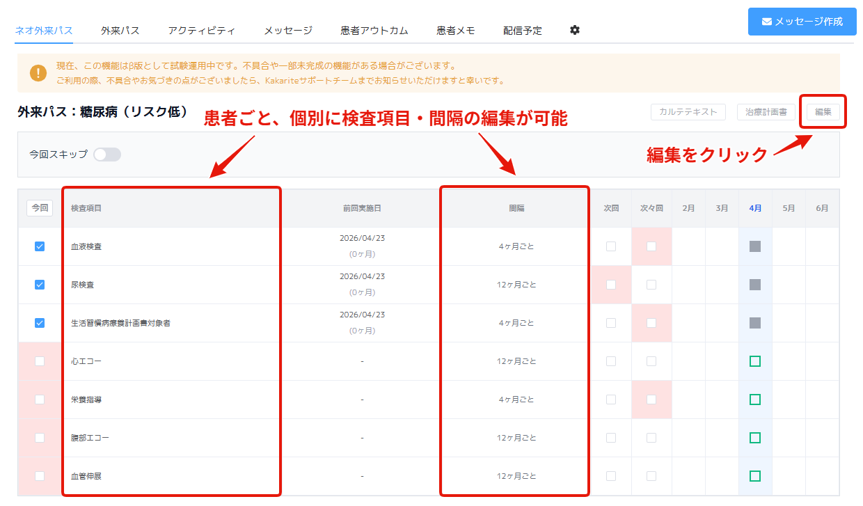 - 検査事項・検査間隔は患者ごと、個別にカスタマイズが可能です。外来パスによって自動的に設定された検査事項・検査間隔で実施しない場合は、編集ボタンをクリックしてカスタマイズしてください。