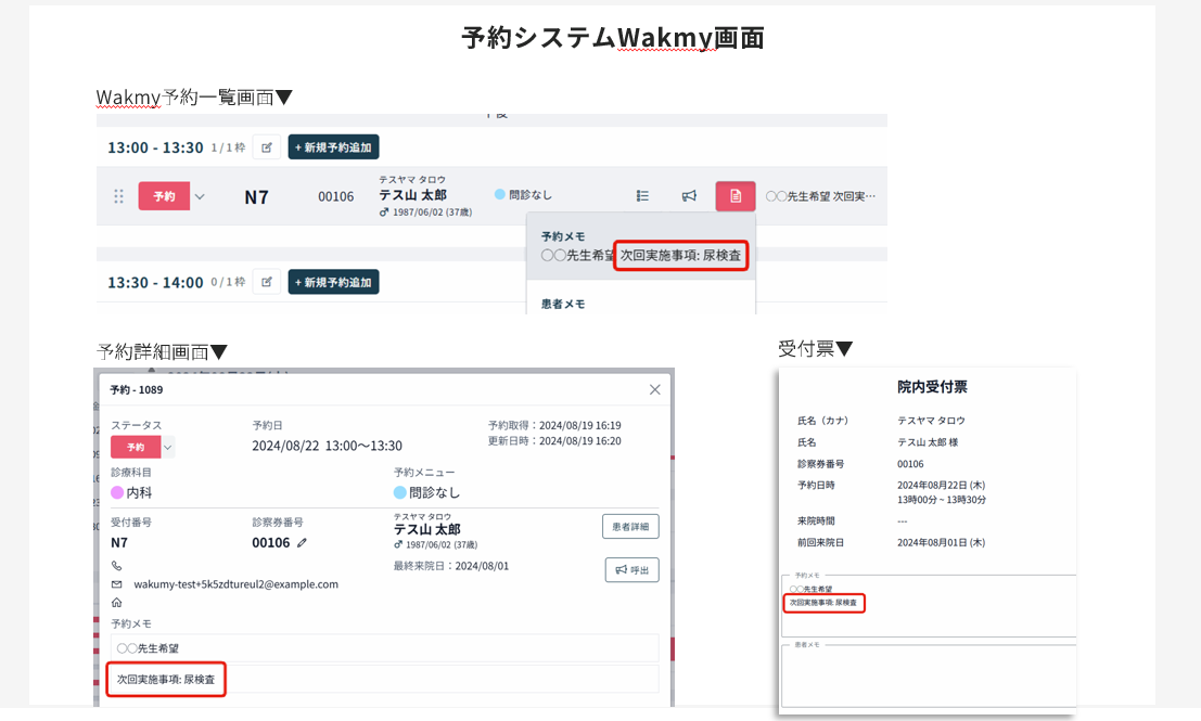 - Kakarite外来パス機能で「次回」に設定した検査項目は、検査実施予定月に予約システムWakmyへ連携され、Wakmyの「予約メモ」から確認することができます。患者の受付時点で検査予定項目を確認することができるため、検査漏れの防止につながります。