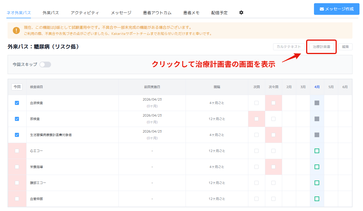 手順1.患者グループの割り当て2.患者グループ割り当て後の外来パス画面の表示内容3.検査項目や実施スケジュールは「治療計画書」として印刷が可能4.医師は次回実施する検査項目にチェックをつけ検査オーダーを出す5.スタッフは実施した検査にチェックをつけて記録するよくある質問関連記事