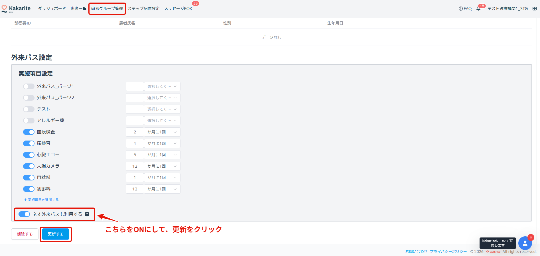 ②ネオ外来パスを利用したい場合は、患者グループ管理画面の外来パス設定、実施項目設定の最下部にある「ネオ外来パスも利用する」をオンにしてください。
