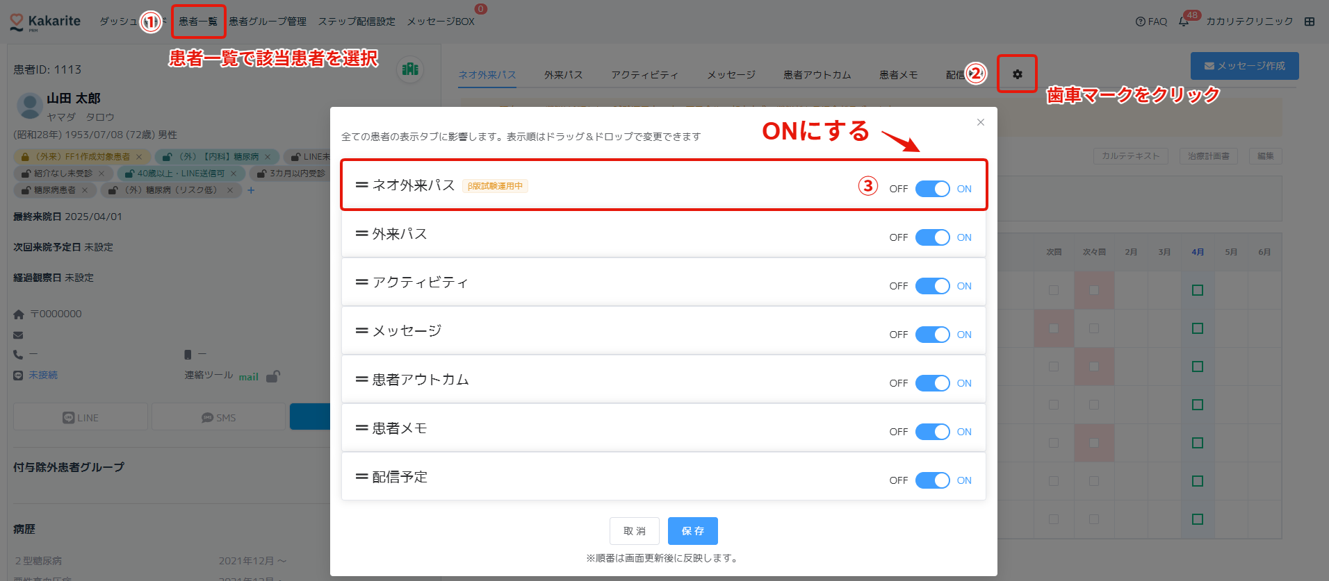 ①患者一覧画面で該当患者を選択し、設定⚙からネオ外来パスの表示をオンにしてください。