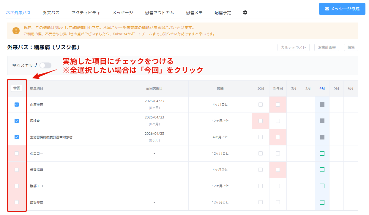 ②検査が完了したら、その日に実施した検査の「今回」欄にチェックをつけてください。このチェックによって、カカリテに実施日が記録されます。