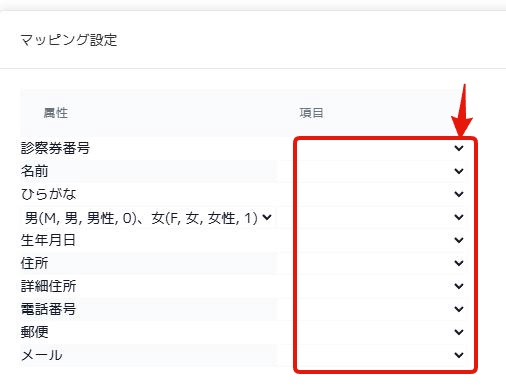 患者情報CSVの項目とカカリテの項目を対応させるため、マッピング設定を行います。