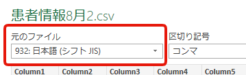 ④「元のファイル」を、「シフトJIS」を選択し「読み込み」をクリック