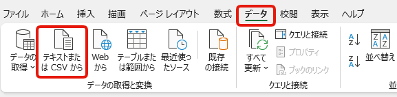 ②「データ」タブ を選択→ 「テキストまたはCSVから」をクリック