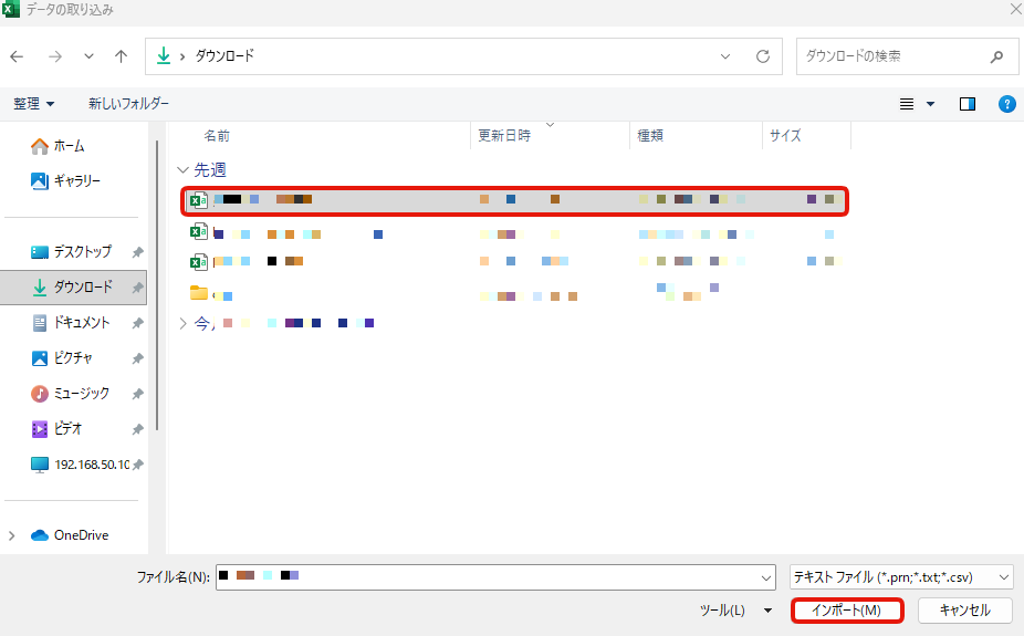 ③確認するCSVファイルを選択→インポートをクリック