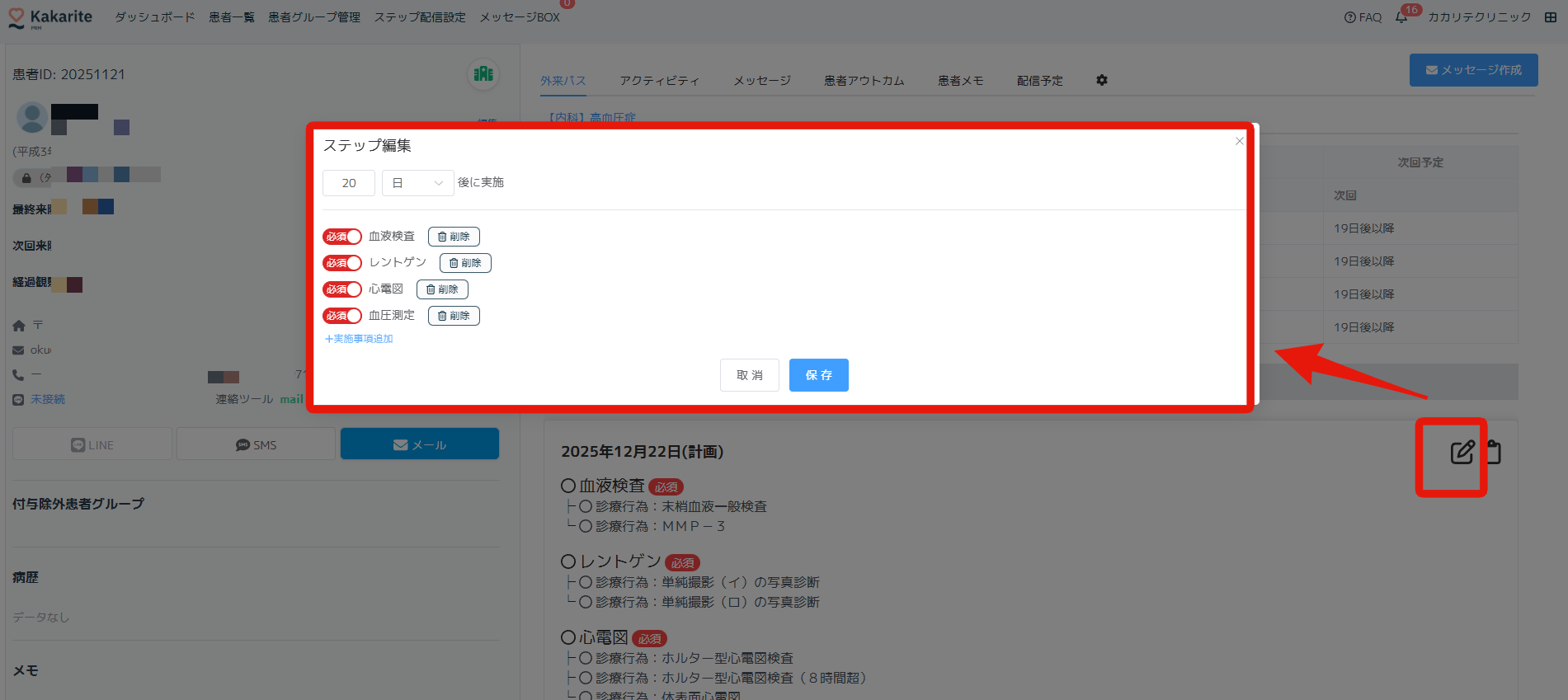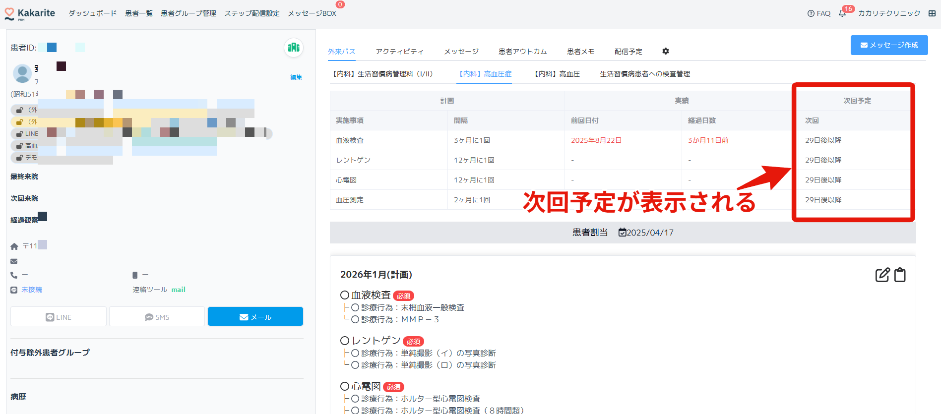 患者詳細画面から、患者ごとに検査等の実施計画を登録することが可能です。また、設定した検査実施予定月にその検査項目を予約システム ワクミーへ連携することができます。