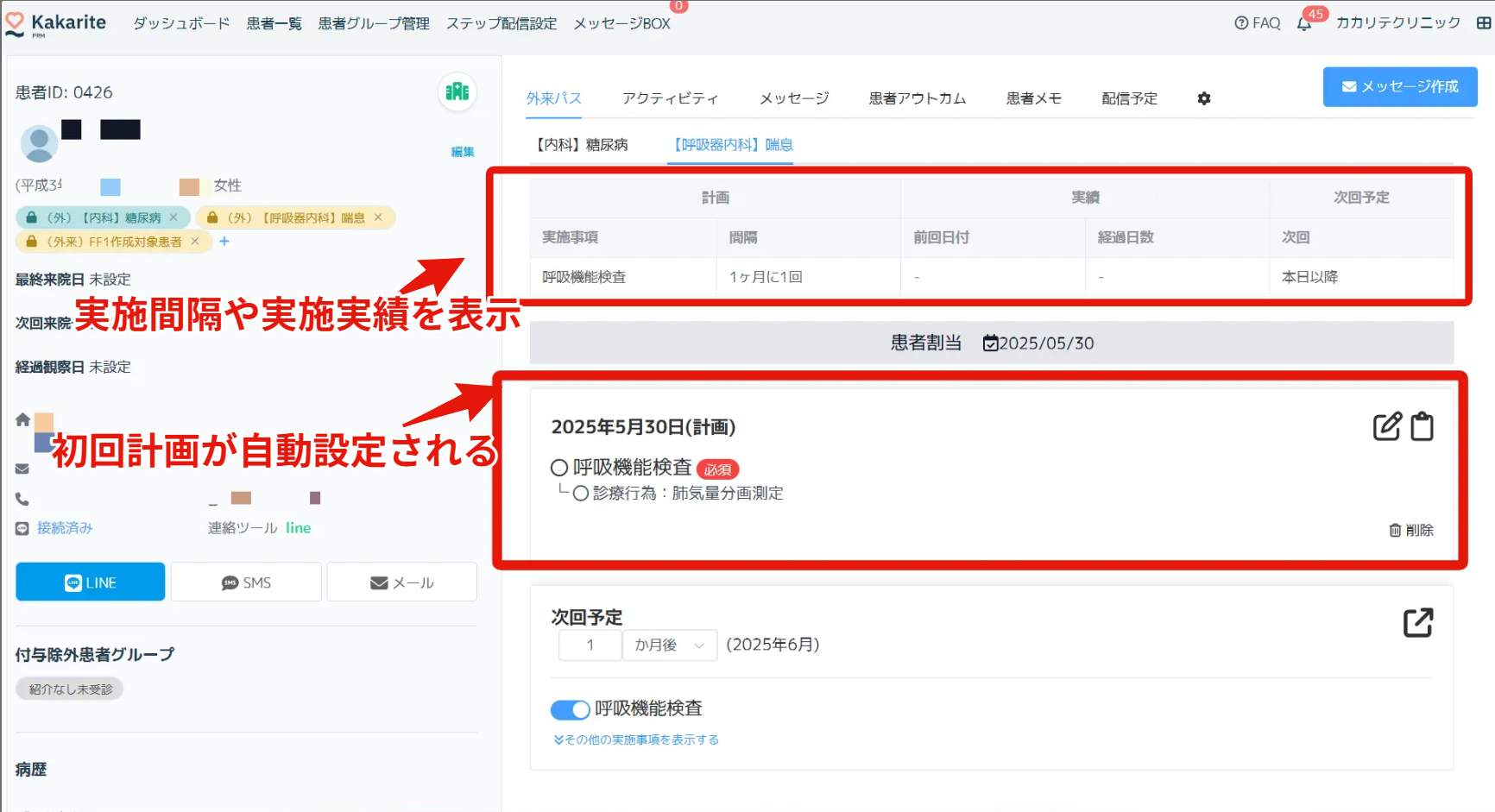 患者割当された(外来パスが設定された患者グループにその患者が追加された)日付で計画が自動設定されているので、実際に実施する時期を検討してください。実施する間隔や実施実績は「計画」「実績」欄に表示されているので、実施時期を検討する際に参考にしてください。